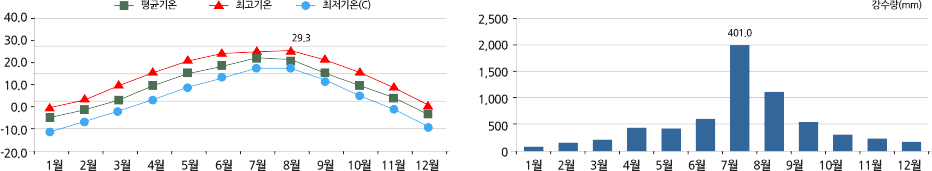 年平均気温は10.5℃、最も暑い月である8月の月平均気温は23.9℃、最も寒い月である1月の月平均気温はマイナス5.3℃で、年較差は29.1℃です。