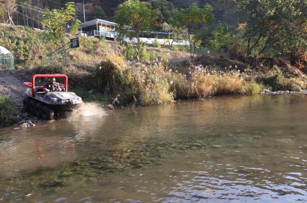 여름을 한방에 날려버릴 것 같은 자갈길 코스, 물길코스도 있다. 속력이 조금 붙으면 내리막길과 함께 물속으로 거침없이 돌진한다. 그 짜릿함이란 아직도 생생하다. 물속으로 다이빙을 했다면 이제 속력을 조금 더 내 물길을 내달려보자! 앞뒤로 튀는 물과 산에서 불어오는 바람과 함께 정말 즐겁게 아르고를 탔다. 이 무거운 녀석을 끌고 높은 경사를 오르고 내리는 건 물속만큼이나 짜릿하다. 방지턱처럼 생긴 경사를 여러 개 넘어 다니며 신나게 즐겨보자!!